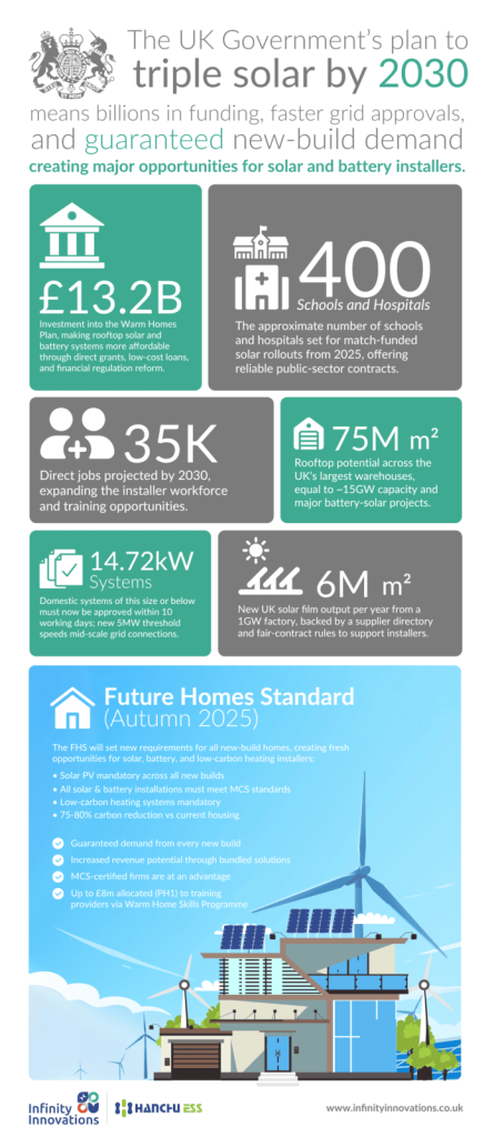 The government’s Warm Homes Programme commits £13.2 billion to accelerate rooftop solar and battery adoption through grants, low-interest loans, and local authority funding. Key initiatives include: